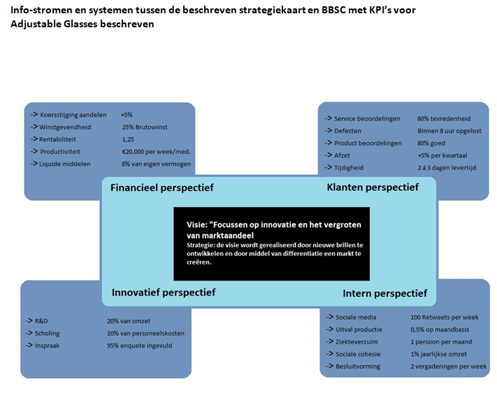 Voor de marketing van Adjustable Glasses is er een KPI van hoge populariteit op sociale media opgesteld, met als norm van minimaal 100 re-tweets per week op het sociale media platform Twitter. De KPI van hoge populariteit op sociale media is gekoppeld aan het uitbrengen van het product in de strategiekaart van Adjustable Glasses (zie figuur strategiekaart). De kwaliteit wordt getoetst met de uitval productie KPI, deze KPI heeft als norm dat de uitval in de productie maximaal 0,5% op maandbasis bevat. De KPI uitval productie is gekoppeld aan de controle kwaliteit product in de strategiekaart van Adjustable Glasses (zie figuur strategiekaart). De KPI laag ziekteverzuim moet ervoor zorgen dat de medewerkers gemotiveerd blijven om te werken, daarom is de norm van de KPI gesteld op maximaal 1 ziekteverzuim per maand. De KPI sociale cohesie moet ervoor zorgen dat tussen de afdelingen en medewerkers beter kunnen samenwerken. De norm is daarom gesteld op een investering in teambuilding en personeelsuitjes met een bedrag van minimaal 1% van de omzet op jaarbasis. De medewerkers vormen de ruggengraat van Adjustable Glasses, daarom zijn de KPI’s ziekteverzuim en sociale cohesie gekoppeld aan het uitbrengen van het product in de strategiekaart (zie figuur strategiekaart). De KPI besluitvorming moet ervoor zorgen dat Adjustable Glasses zich als organisatie intern blijft ontwikkelen en ontwerpen. De norm is daarom gesteld op minimaal 2 vergaderingen per week om na te denken over de mogelijke ontwikkelingen van Adjustable Glasses. De KPI besluitvorming is gekoppeld aan het ontwerpen en ontwikkelen in de strategiekaart (zie figuur strategiekaart).